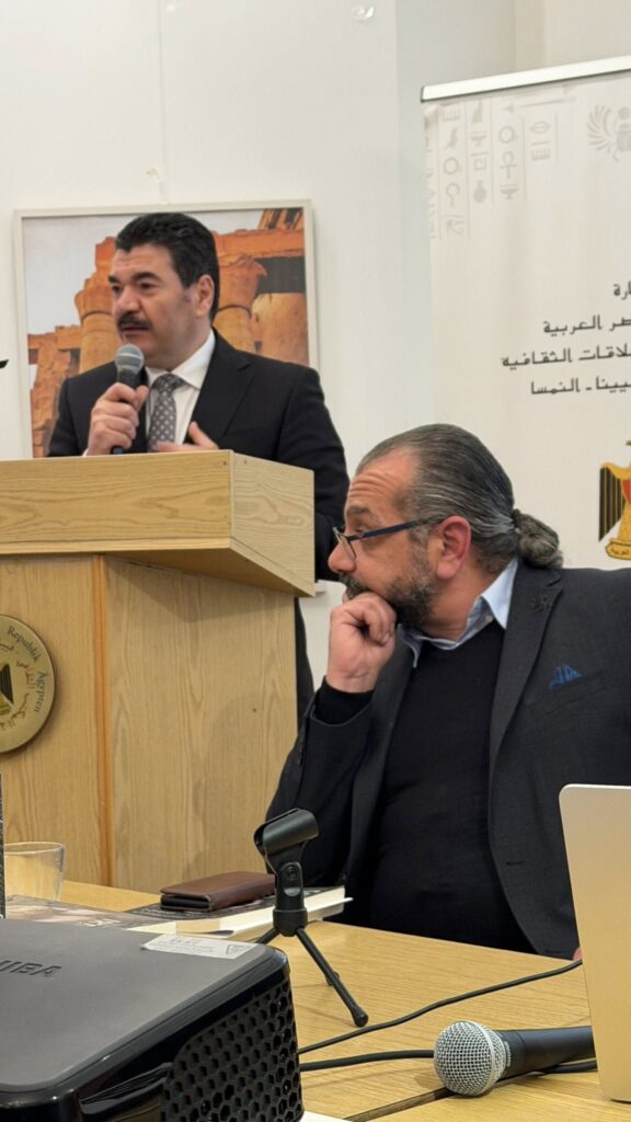 افتتح الأمسية الأستاذ الدكتور خالد أبو شنب، مدير مكتب مصر للعلاقات الثقافية والتعليمية، بكلمة رحب فيها بالحضور الذين ضاقت بهم القاعة، مؤكدا على استراتيجية المكتب في أن يكون منصة ليس فقط لعرض التراث، بل لمناقشة “علوم المستقبل” وربط الجالية بالتحولات الكونية الكبرى. وقد تجلى الدور المحوري للدكتور “أبو شنب” في قدرته على خلق شراكات ثقافية ناجحة، ظهرت في التعاون المثمر مع “البيت العربي النمساوي للثقافة والفنون” برئاسة الأستاذ محمد عزام.