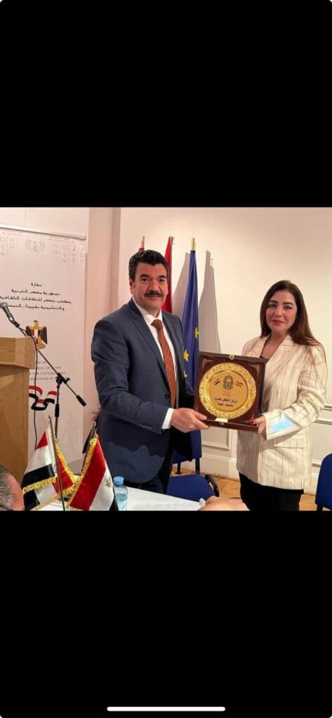 Im Anschluss der Veranstaltung ergriff Prof. Dr. Khaled Abou Shanab das Wort, um die Stars dieser kulturellen Begegnung zu ehren: die Schriftstellerin Dina Sharaf El-Din, die die Anwesenden in die Welt der Worte entführte; den Journalisten Mohamed Azzam, der die Diskussion auf eine Weise moderierte, die Seriosität mit Wärme verband; und Herrn Mohamed El-Aschrie, Dolmetscher der Botschaft, der dem Publikum die Brücke der deutschen Sprache schenkte, um mit ihr im Raum des Dialogs zu schweben. Es war ein Moment der Ehrung der Worte, der Dialoge und des Geistes, der die kulturelle Begegnung zu einem unvergesslichen Erlebnis werden lässt.