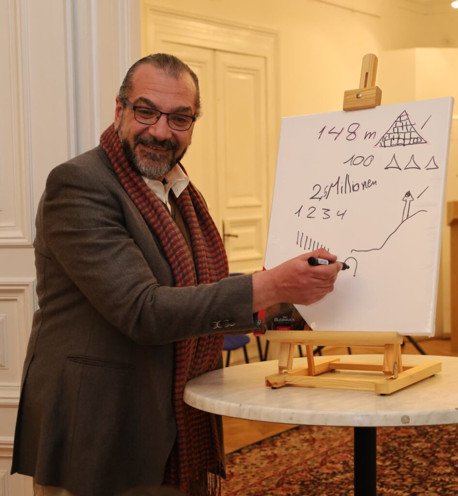 Im Zentrum der Veranstaltung standen zwei Vorträge, die das Große Ägyptische Museum nicht nur als architektonisches Großprojekt, sondern als kulturellen Knotenpunkt präsentierten. Herrn Mohamed Farouk El-Aschrie zeichnete die Entstehungsgeschichte des Museums nach und ordnete es als Ort der Forschung, des kulturellen Gedächtnisses und des internationalen Austauschs ein. Das Museum, so El-Aschrie, verstehe sich weniger als klassische Ausstellungshalle, sondern als lebendiger Raum, in dem Vergangenheit, Gegenwart und Zukunft miteinander ins Gespräch treten.